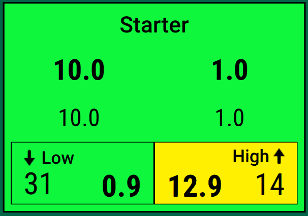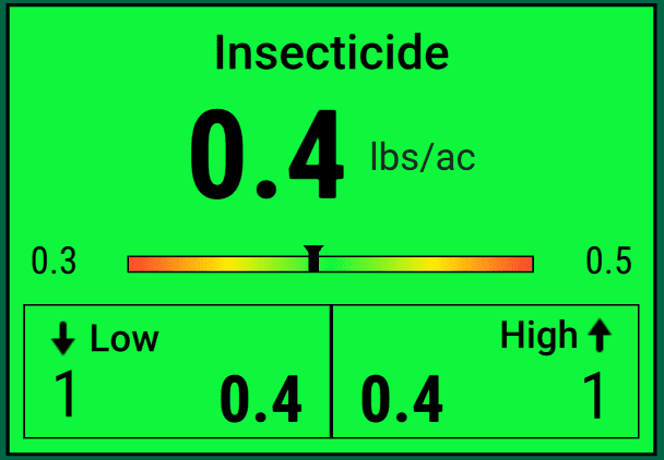 - A two-column chart with Low values on the left and High values on the right. These help you see more clearly the full range of your implement’s performance. Within each box, you’ll see the row number (outside edge) and the metric value at that location (inside edge).
