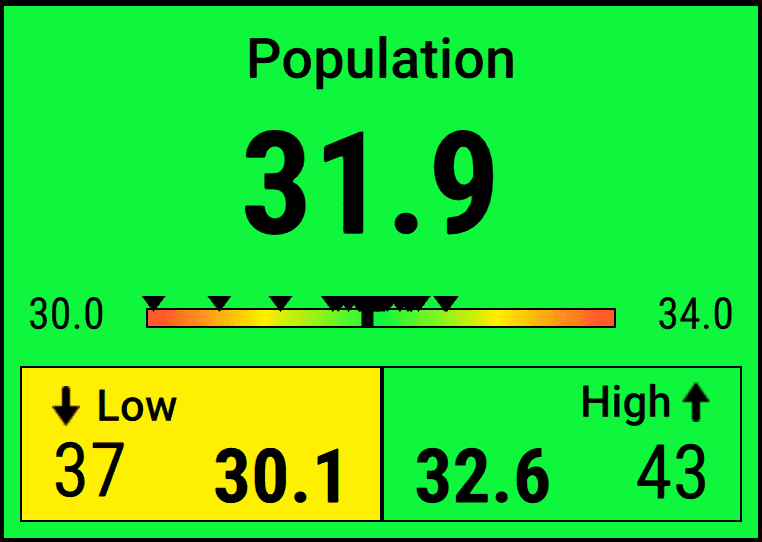 The Population widget tells you how much seed you’re planting per acre. That’s not a running total, though. It’s an extrapolation from your current seeding pace. Essentially, the 20|20 looks in each row to see how much seed you’re planting per square inch, averages that across all rows, and then tells you how many seeds you’d end up planting in an acre if you kept planting at exactly that pace.
