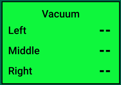 The Vacuum widget displays the readings from vacuum sensors connected to SRMs. In keeping with the 20|20’s three-part implement model (think of the three section switches on the Cab Control Module), the widget display values for the Left, Middle, and Right sections.