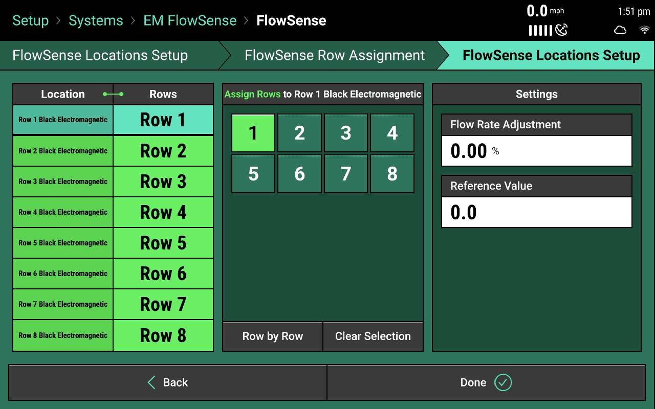In addition to row assignments, each module will also offer you advanced settings to adjust for fine-tuning. Two of those, for EM FlowSense, will be discussed below: Flow Rate Adjustment and Reference Value.